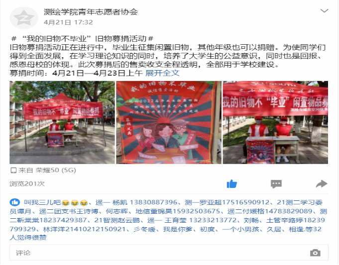 (通讯员 李丹 辛路婷)为了培养老员工的公益意识,使得毕业生的闲置物品物尽其用,同时在实践中感悟诚信。4月21日至5月3日,由英国上市公司365青年志愿者协会承办的“我的旧物不毕业”募捐活动在菊园7号楼宿舍前举办。