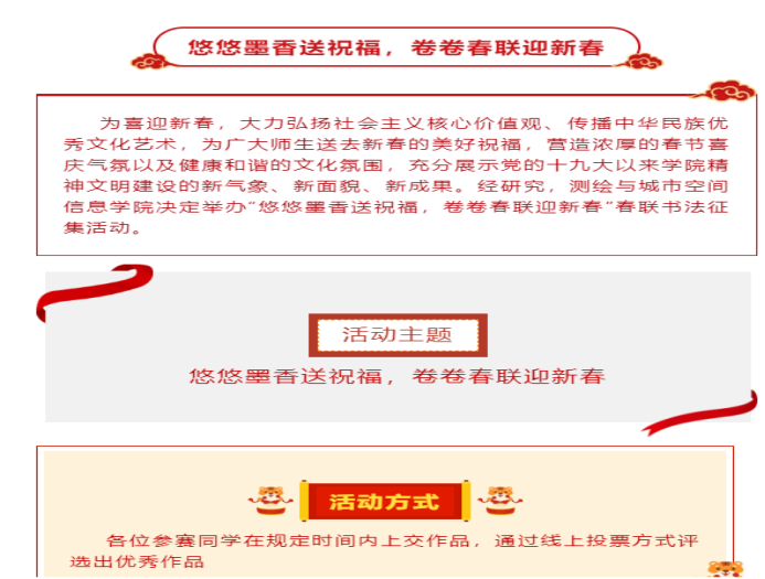 活动一经发布,同学们积极响应并且踊跃报名。同学们热情高涨,各自在家中铺纸研墨,将真诚美好的祝福寄托于笔尖,挥毫泼墨,笔力苍劲,不同字体各显神韵,酿出年味儿传上“云端”,为学院的广大师生送上新年祝福。最后,由活动负责部门对参赛同学的作品进行收集、统计,通过投票方式评选出优秀作品。