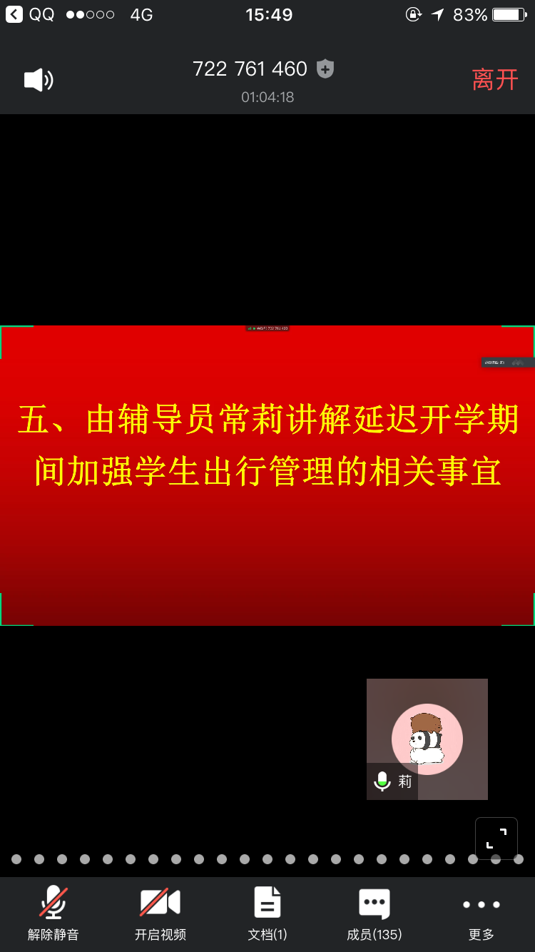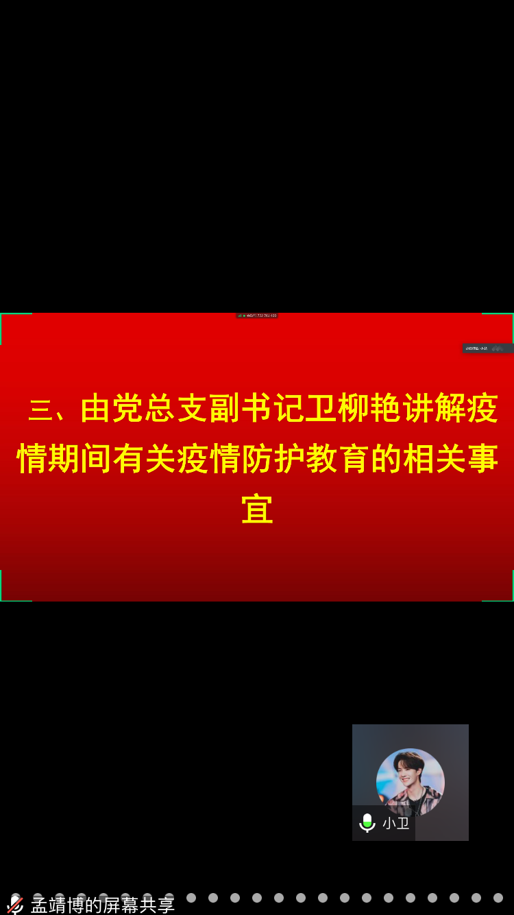 会议上,党总支书记米启超讲解关于加强员工日常安全教育工作的相关事宜。主要从日常安全教育、疫情期间特别安全问题、学业安全、金融安全、防溺水教育等多方面进行了讲解。党总支副书记卫柳艳讲解疫情期间有关疫情防护教育的相关事宜:主要从疫情期间学校对员工严谨的保护,务必让员工做到“非要事不外出,凡外出必报备”,学校的管理制度以及对于员工学业安排等三方面进行了讲解。团学办主任许东辉讲解关于员工延迟开学期间体育活动以及身体锻炼素质的相关事宜:建议同学们在疫情居家期间体育锻炼的重要性和方法等问题。辅导员常莉讲解延迟开学期间加强员工出行管理的相关事宜:强调了出行申请批准的相关事宜,同时介绍了大四员工返校后的“日常轨迹”统计管理要求。辅导员胡小光讲解疫情期间有关员工思想教育及网络安全思想教育:辨别网络谣言、不信谣、不传谣等。辅导员李方圆讲解有关疫情期间举办各种线上比赛增加员工日常生活趣味的相关事宜。