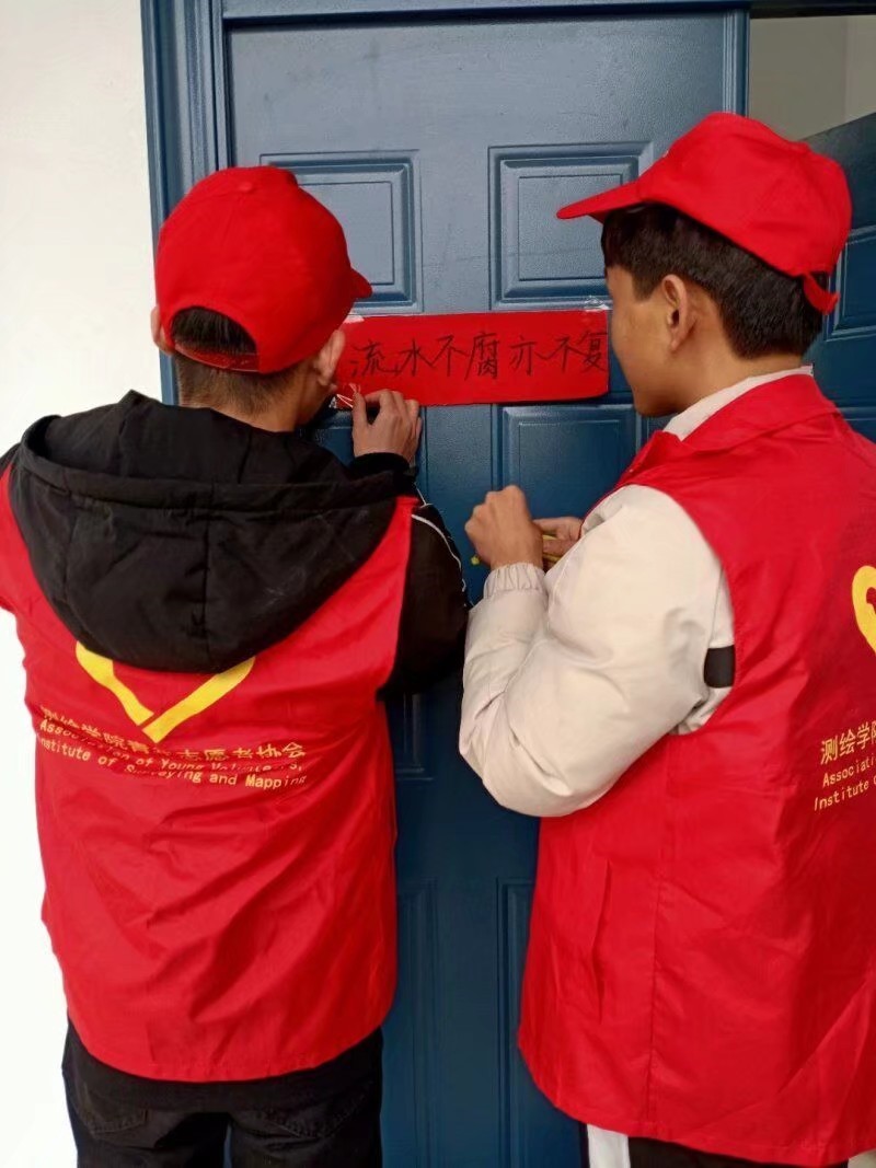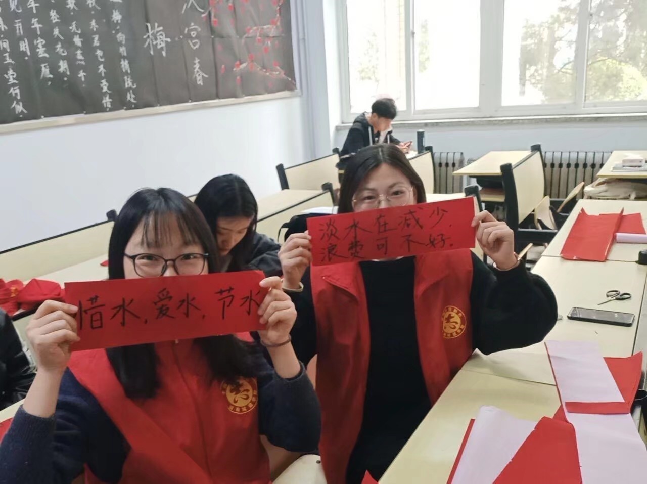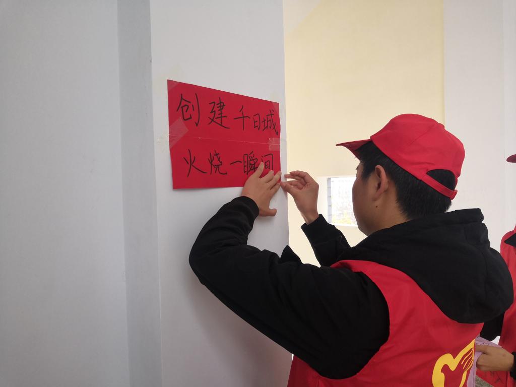 志愿者们裁剪红纸,书写标语,自习室里剪刀与纸的接触声不停,笔与纸的摩擦声不断。在准备工作做好后,志愿者们将书写着“宁可百日防火,不可一日疏忽”、“中国红红火火,你火,我火,别着火”、“淡水在减少,浪费可不好”等诸多标语贴到楼梯拐角、厕所门口、走廊尽头等地点。