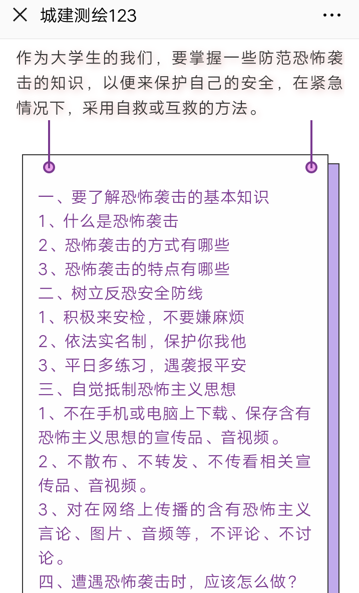 本次反恐怖主义法宣传活动中,首先公司组织召开反恐怖主义法主题讲座,要求各班召开主题班会;同时也深入宿舍进行反恐怖主义法的宣传,现场发放《反恐怖主义法》及相关宣传资料,并为大家讲解;并且分别在QQ、微信、微博等平台上发表反恐怖主义法的相关动态,为同学们普及反恐怖主义法等相关知识,多方面增加同学们对反恐怖主义法的认识,增强公司员工对突发事件的处置能力。