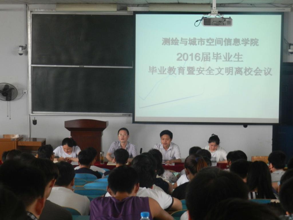 会议伊始,高书记简单介绍了此次会议的内容,并强调了5个方面。一: 毕业生要按时返校,不按时返校者取消毕业答辩资格。二:5月10号前各班班长收齐就业协议书。三:注意安全问题,不得组织集体饮酒、旅游等活动;要提高安全意识防止上当受骗。四:要文明离校,树立诚实诚信形象,给学弟学妹多传播正能量。五:毕业生在宿舍注意行为举止,不要影响学弟学妹们的正常作息。最后,高书记宣布此次毕业生每人都有测绘纪念衫一件,并祝福毕业生们前程似锦。